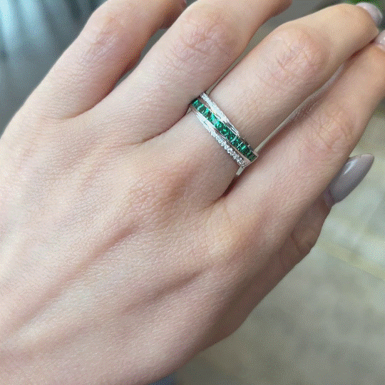 Oro Blanco 18k con 15 Esmeraldas de laboratorio corte princess de 2x2mm y Diamantes corte brillante que suman 20 pt