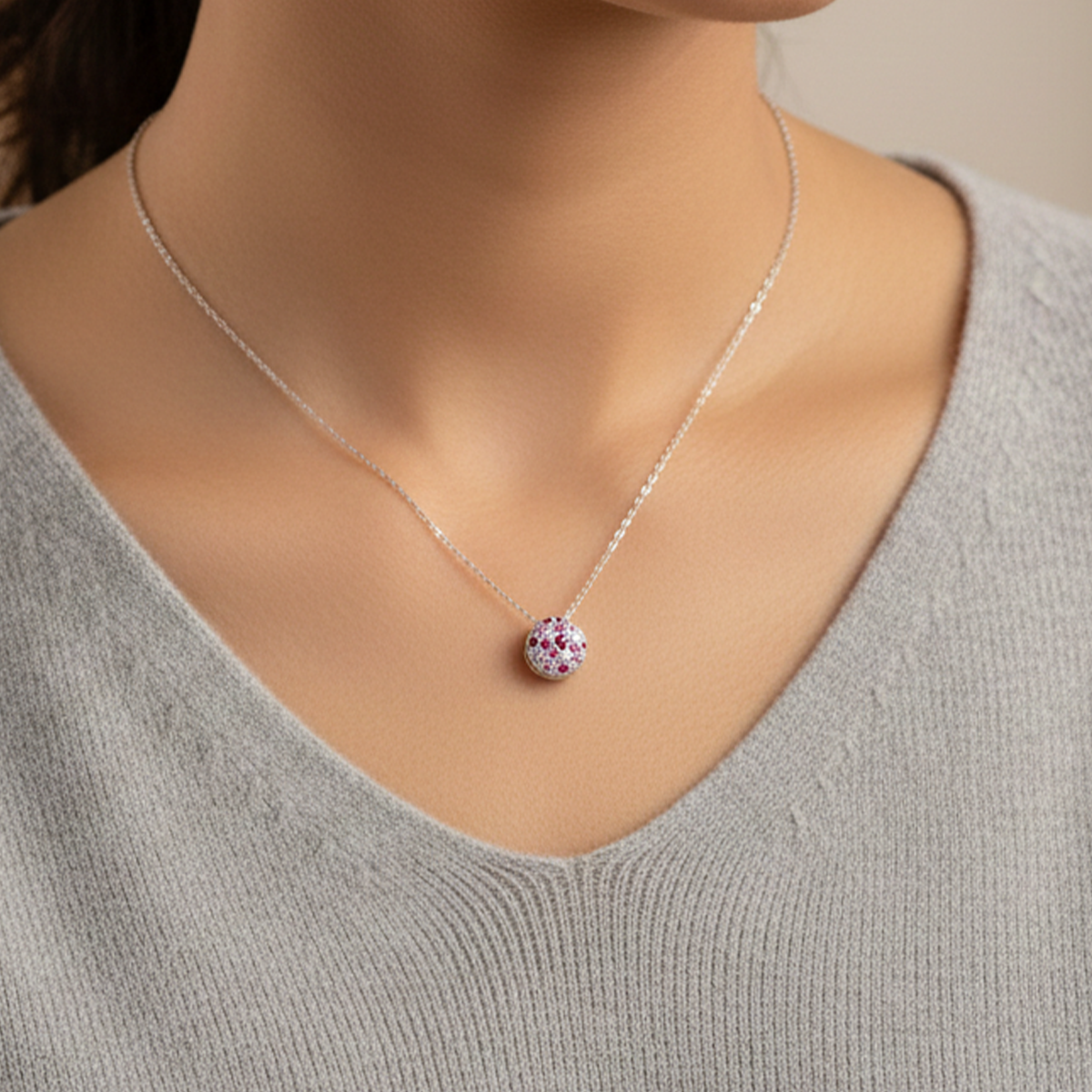 Oro Blanco 18k, con 4 Diamantes que suman 3 pt, más 5 Rubíes que suman 6 pt, más 9 Zafiros Rosado que suman 11 pt.