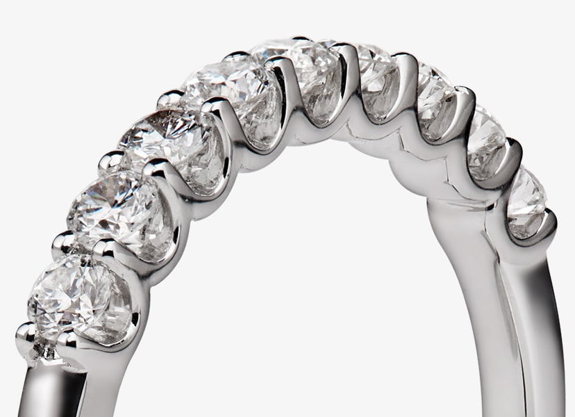 La elegancia y hermosura del anillo de compromiso llevado a su expresión práctica y moderna en la disposición extendida de sus piedras a lo largo de la banda.