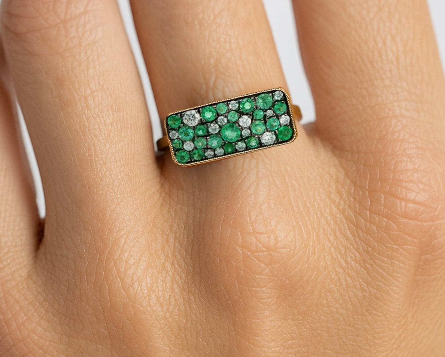 Las esmeraldas y diamantes del Anillo Lisboa forman un lienzo brillante y geométrico, un tapiz verde y claro en un marco de oro cálido. Al usarlo, cada destello evoca esperanza y equilibrio, mientras su mosaico refleja armonía y delicadeza y la saudade deen los momentos íntimos y logros añorados.