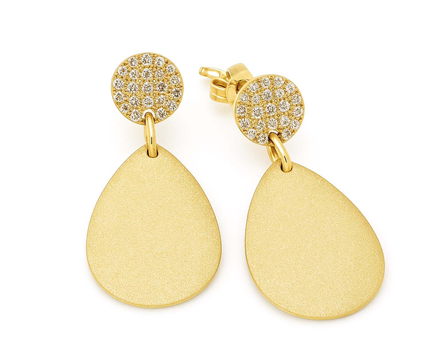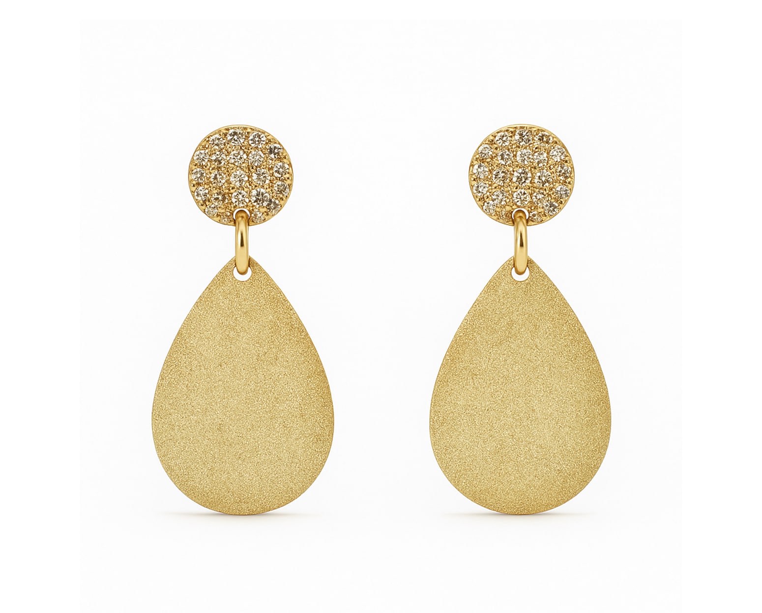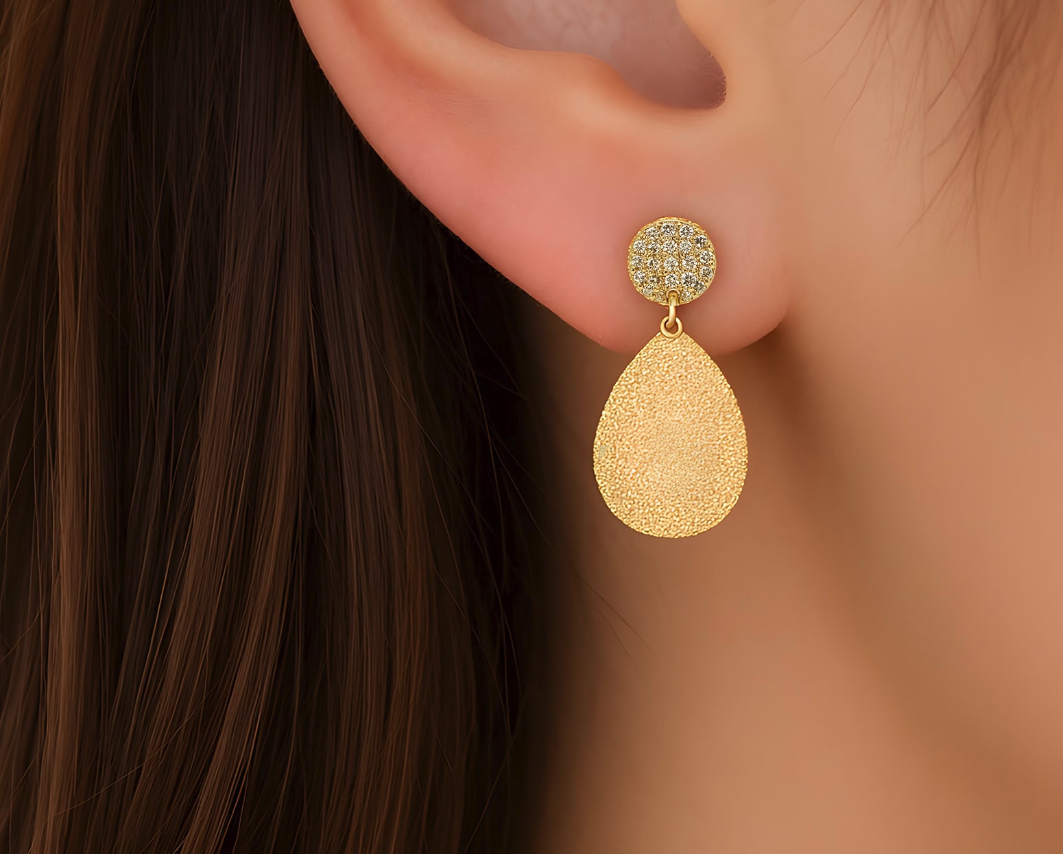 En las facetas de los Aros Drop Pera Mate, los diamantes tejen una danza de luces sobre la piel, reflejando cada movimiento en destellos futuristas. El diseño en forma de lágrima abraza el lóbulo, colmando el espíritu con una audacia progresista, un eco de modernidad e innovación que resuena en todos los sentidos como un susurro de lo que está por venir.