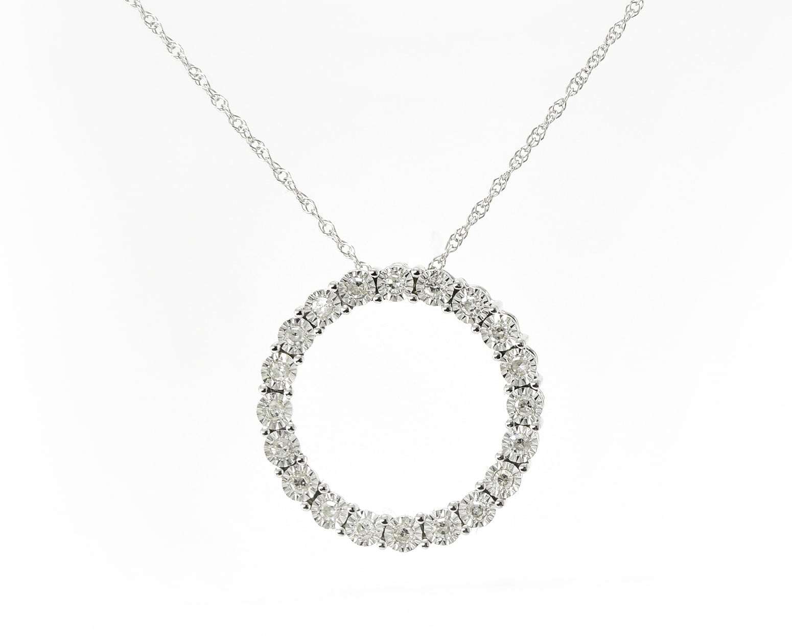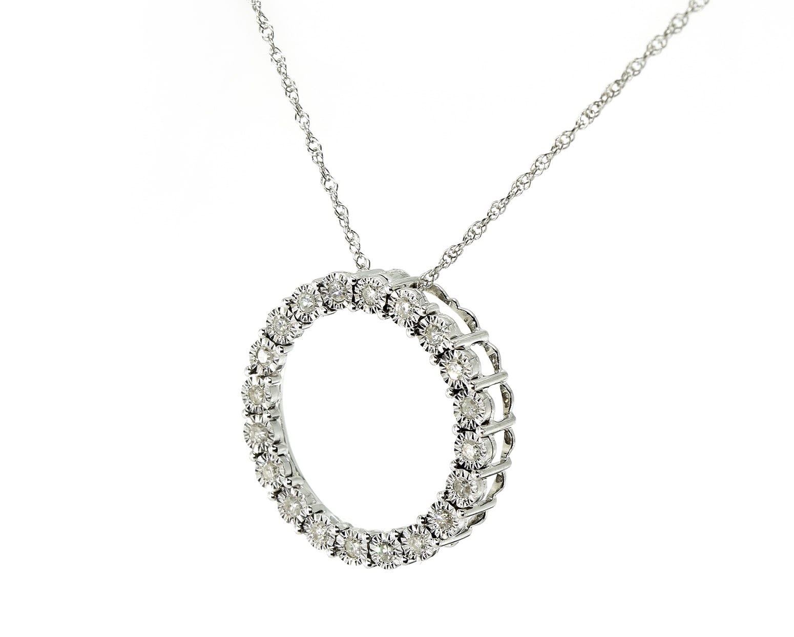 El Colgante Miracle resplandece con su halo de diamantes brillantes, cada piedra delicadamente engarzada en un círculo de oro que transcurre unificado en un abrazo celestial. La cadena delicadamente dual, con eslabones alternados, descansa sobre la piel acariciándola con una textura refinada, logrando un impresionante equilibrio entre lo sublime y lo despampanante.