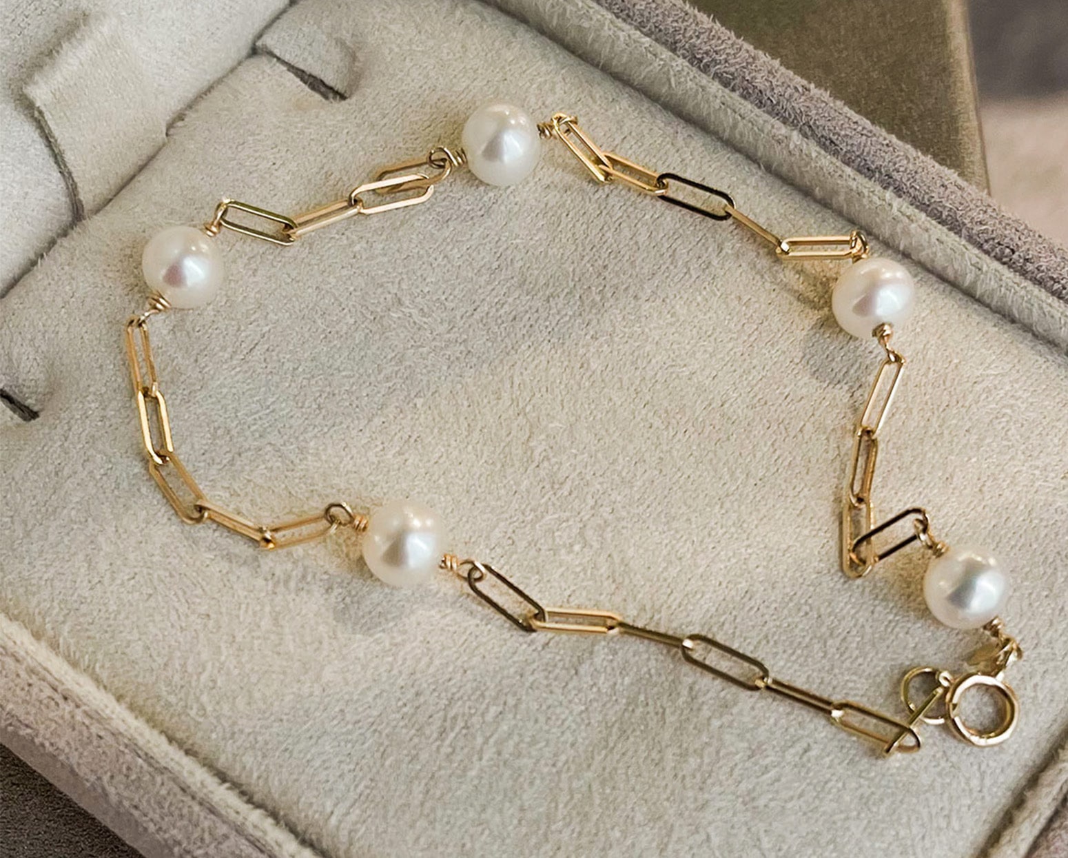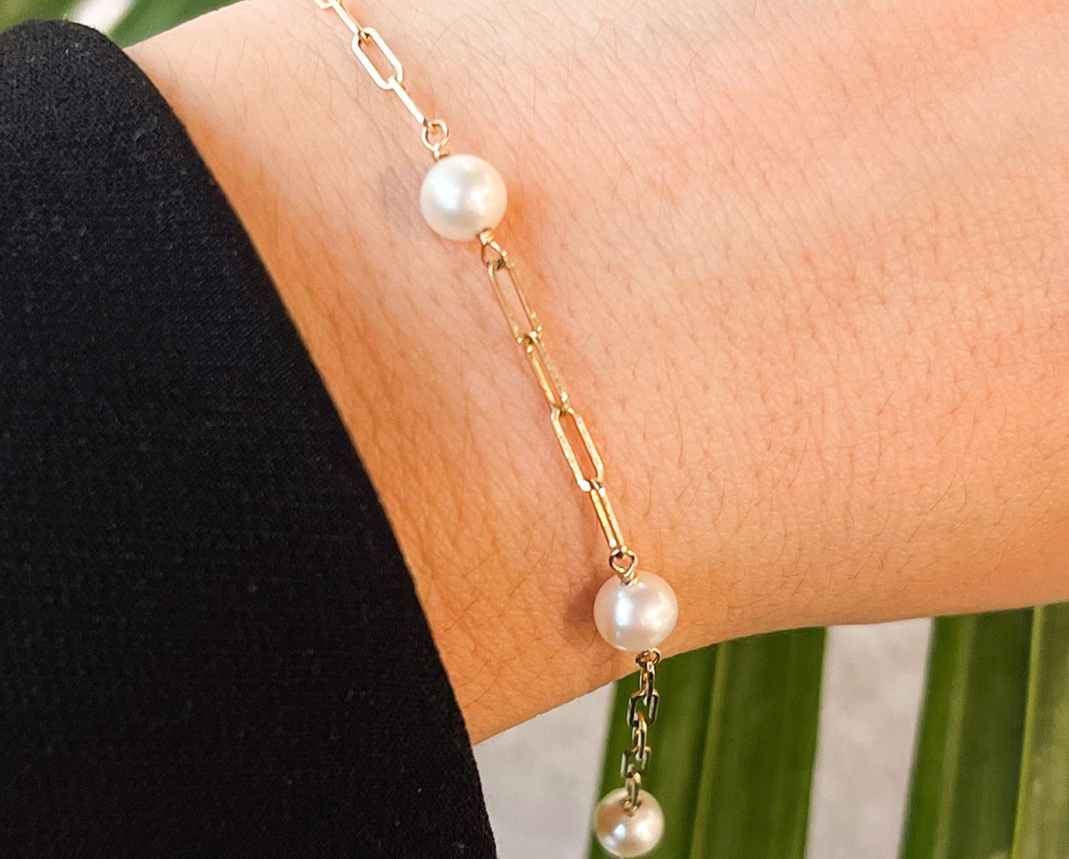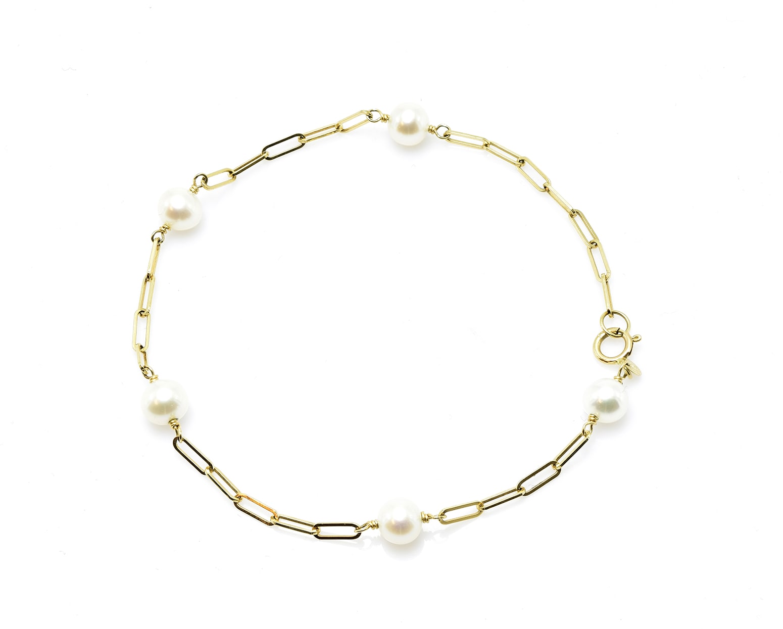 La Pulsera Paper Clip Perlas, con su oro amarillo, encierra la cálida serenidad de un amanecer dorado, su brillo suave y sus eslabones rectangulares danzan con la luz. Las perlas, etéreas y soñadoras, flotan como pequeñas estrellas en una constelación, susurrando historias de sueños cumplidos y nuevos caminos abiertos, envolviendo a su dueña en un abrazo delicado y romántico, que celebra la belleza serena del cambio y el logro personal.