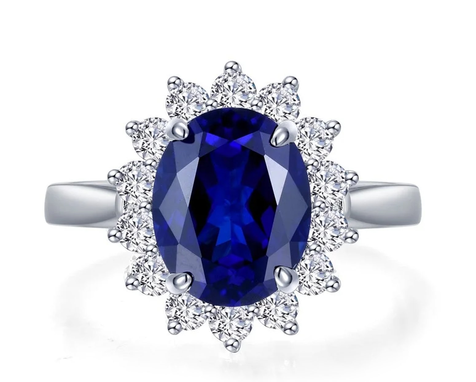 | Piedras | 1 Zafiro de Laboratorio corte oval de 10 x 8 mm y 14 Moisanitas corte brillante |