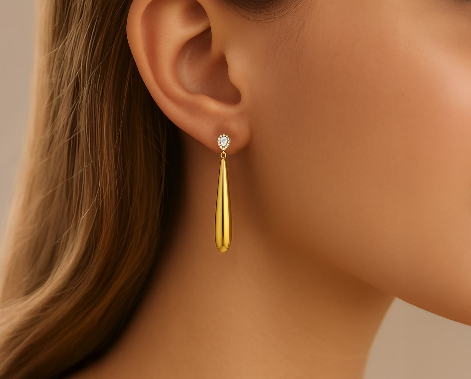 Los Aros Lágrima Larga resplandecen en su delicado diseño, rematados por la elegancia de brillantes diamantes. Los delicados detalles del engaste van renovando su brillo con cada movimiento, evocando ternura y sofisticación, casi como si contaran secretos al oído de quien los porta.