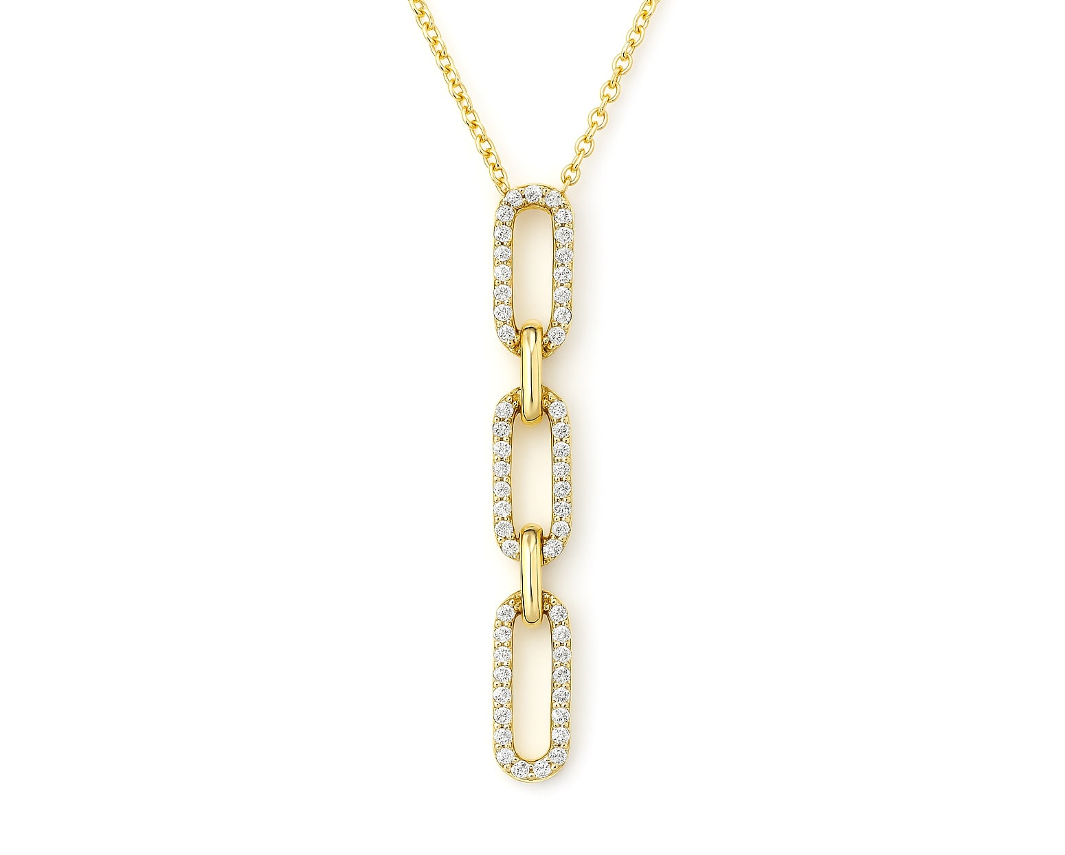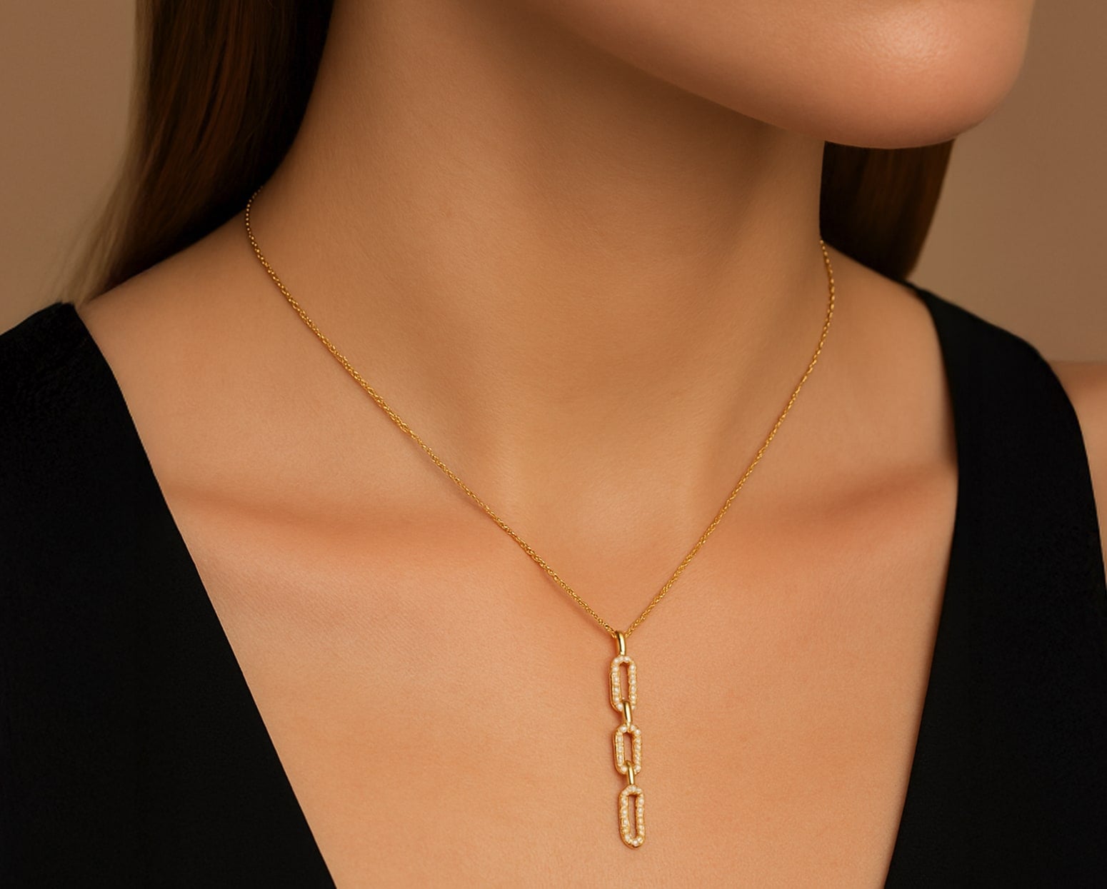 El Colgante Paper Clip Triple yace delicadamente sobre la piel, irradiando un resplandor tenue con sus eslabones de oro amarillo que parecen flotar suavemente. Los diamantes dispersos ofrecen destellos fugaces que recuerdan sueños bajo el cielo nocturno, evocando una sofisticación atemporal y una libertad elegante. La forma estilizada, parecida a finos enlaces suspendidos, honra conexiones y avances sutiles, mientras ese brillo sutil en cada movimiento refuerza la elegancia discreta en cada paso hacia adelante. Cada detalle del diseño refleja una pasión por lo auténtico, embelleciendo los logros personales y celebrando la fortaleza interna.