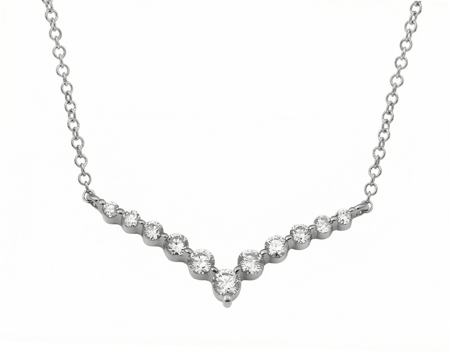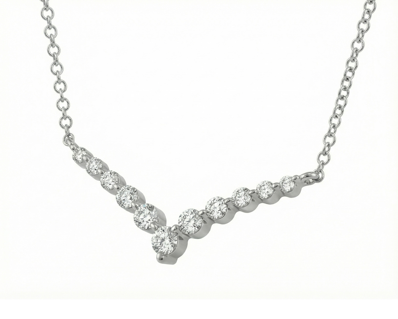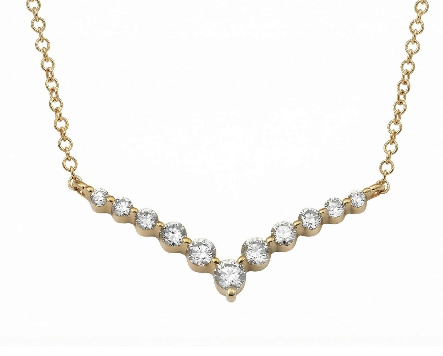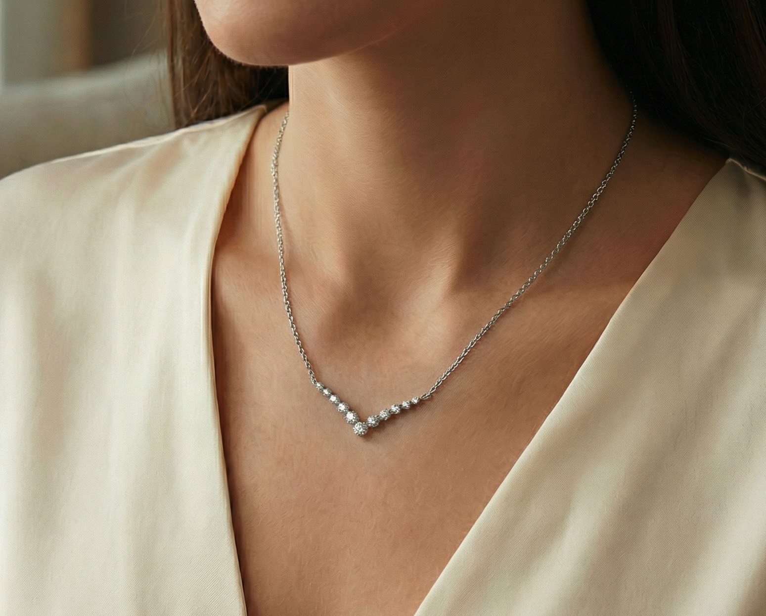 Al usarlo, la curva invertida descansa en el pecho con una luz cálida y cercana, y cada diamante aporta un destello pequeño pero constante que acompaña el movimiento con gracia. Es una pieza que se siente íntima y femenina, una presencia luminosa que realza sin esfuerzo y deja una impresión poética y serena en cada ángulo.