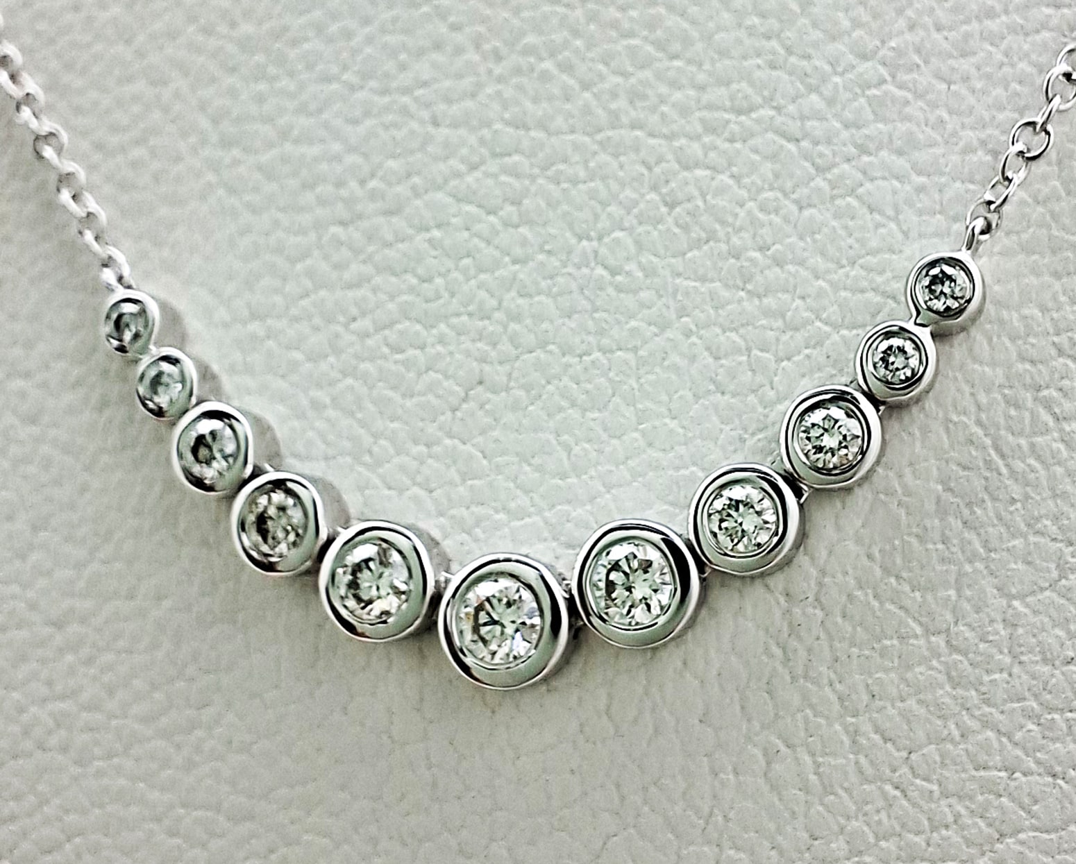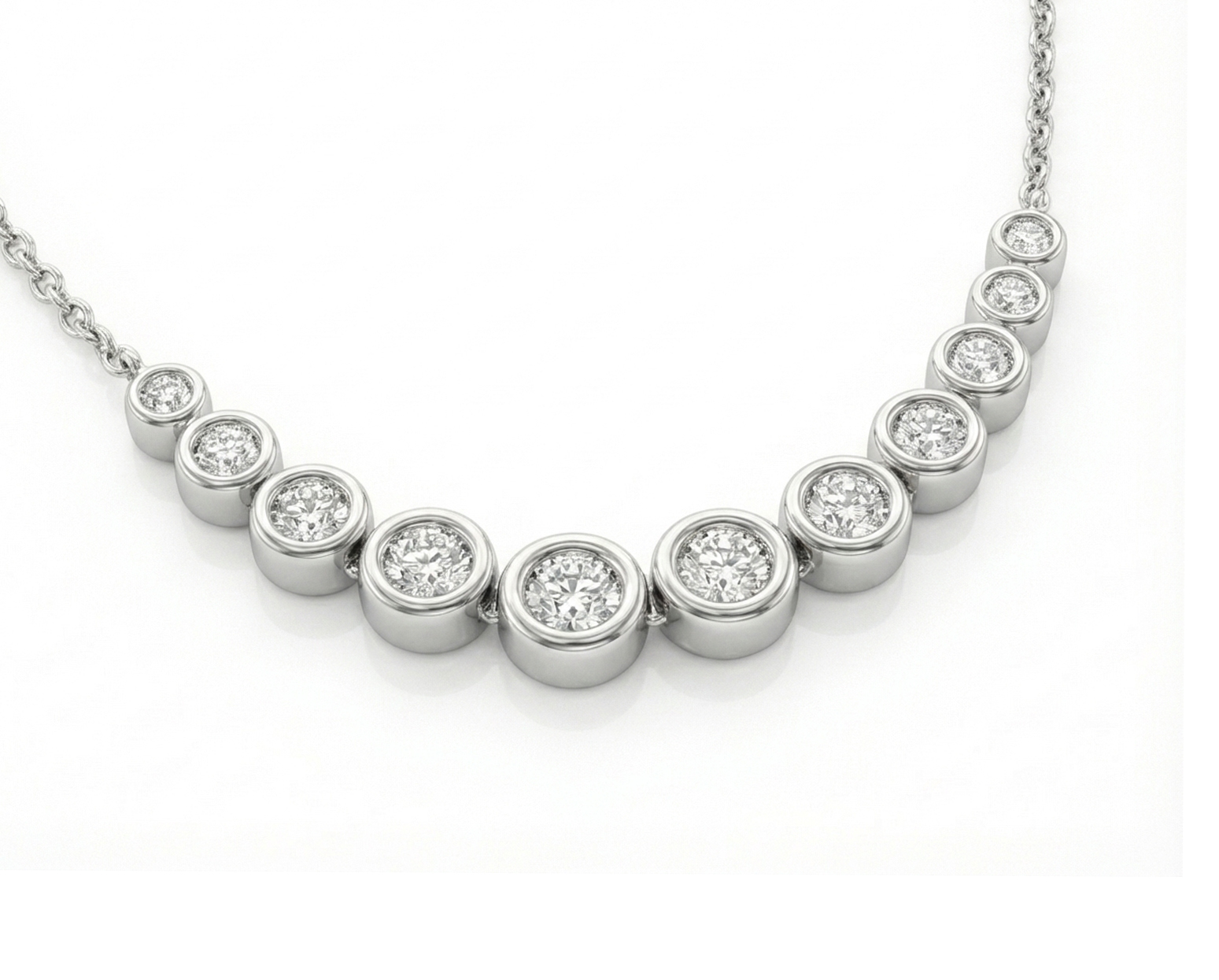 El Collar Rondelia organiza once diamantes en engaste bisel, graduados en tamaño y articulados en una curva suave que se sostiene entre dos cadenas finas de oro blanco. Su secuencia ordenada y su estética nítida lo vuelven especialmente atractivo para mujeres de gustos minimalistas, que valoran la pureza de las formas circulares, la simetría serena y un brillo que se integra con naturalidad en cualquier look.