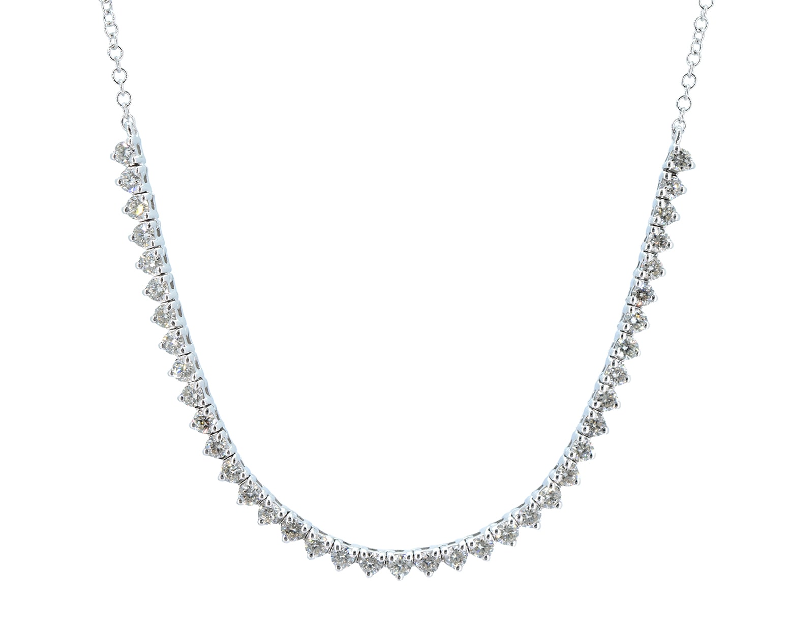 Al llevarlo, la curva de diamantes acompaña el pecho con un resplandor continuo que responde a cada movimiento. Esa luz frontal, discreta en volumen pero intensa en destellos, crea una presencia elegante y evidente, de esas que elevan cualquier look sin esfuerzo y dejan una huella brillante en cada ángulo.