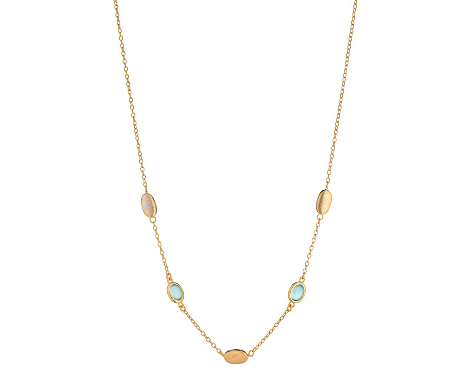 La secuencia de cuarzos aqua pulidos y volúmenes metálicos irregulares del Collar Cuarzo Aqua crea un acento limpio que flota delicadamente en el centro del cuello. El ritmo entre color suave y metal pulido mantiene la composición clara y moderna, como una línea ordenada que respira con luz propia sin recurrir a adornos adicionales.