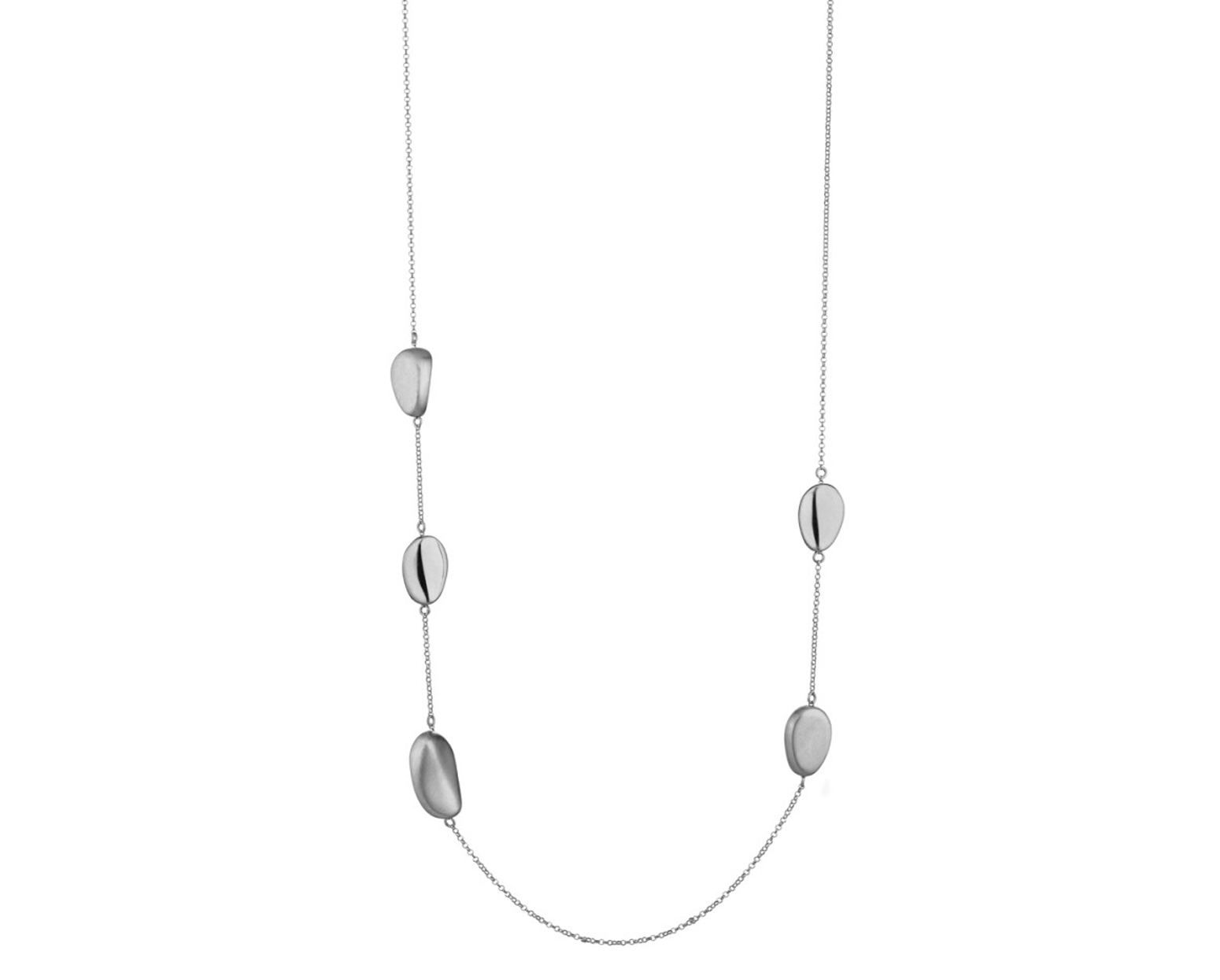 Las cinco piezas metálicas irregulares del Collar Ovra se distribuyen de forma asimétrica sobre la cadena, como pequeños fragmentos modelados a mano que dialogan entre sí en una línea contemporánea. Cada módulo refleja la luz desde un ángulo distinto, lo que convierte la composición en un gesto dinámico y escultórico que cambia con el movimiento.
