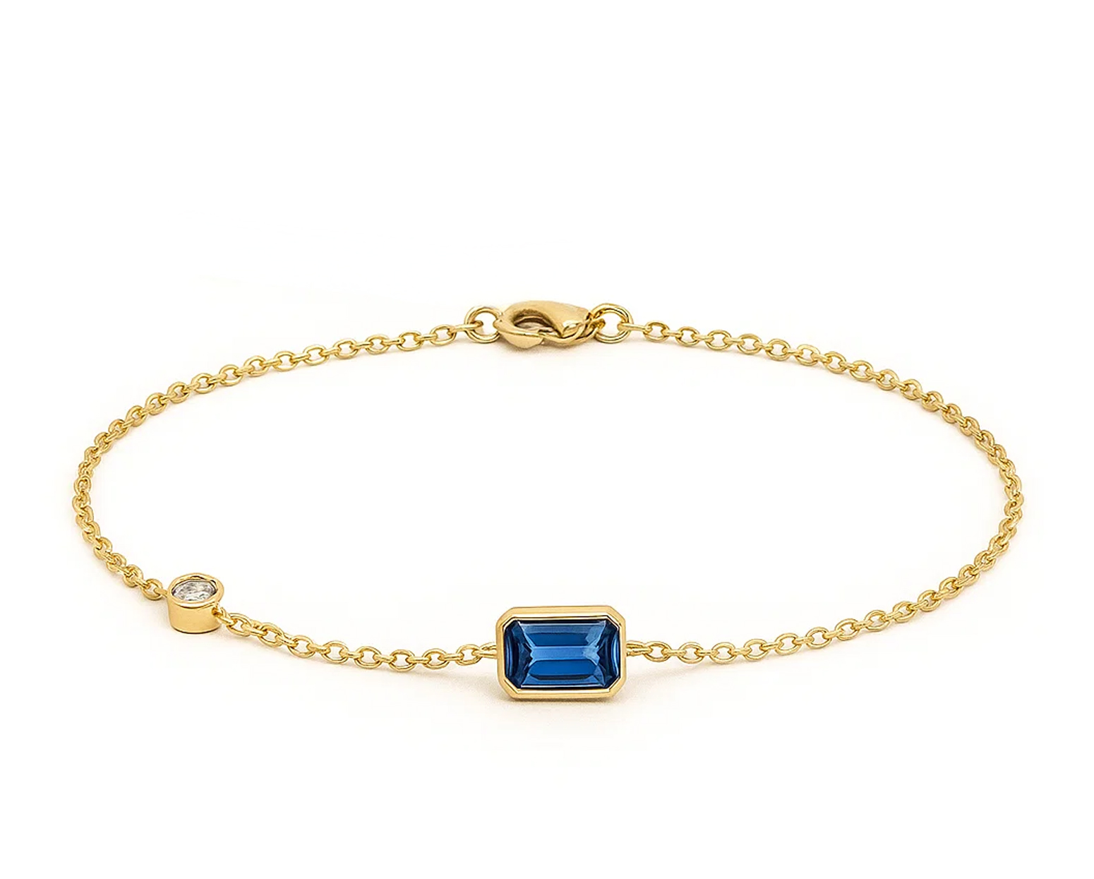 La Pulsera Zafiro Con Punto De Luz susurra elegancia y sofisticación en su maquillaje de oro amarillo de 18 quilates. El zafiro de laboratorio, esculpido en talla esmeralda, destella serenidad y optimismo, resonando con cada gesto en sutil armonía con el circón que aporta un toque de brillante modestia.