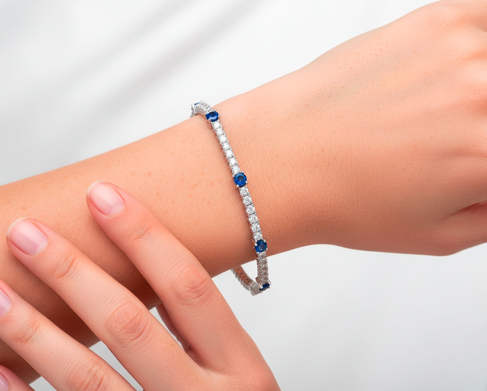 Al llevarla, el movimiento de la muñeca activa un juego de reflejos nítidos donde el pavé crea un resplandor constante y los zafiros aparecen como acentos vibrantes que elevan toda la composición. Es de esas pulseras que iluminan al instante: liviana, flexible y llamativa, con un brillo que se percibe incluso antes de mirar directamente la pieza.