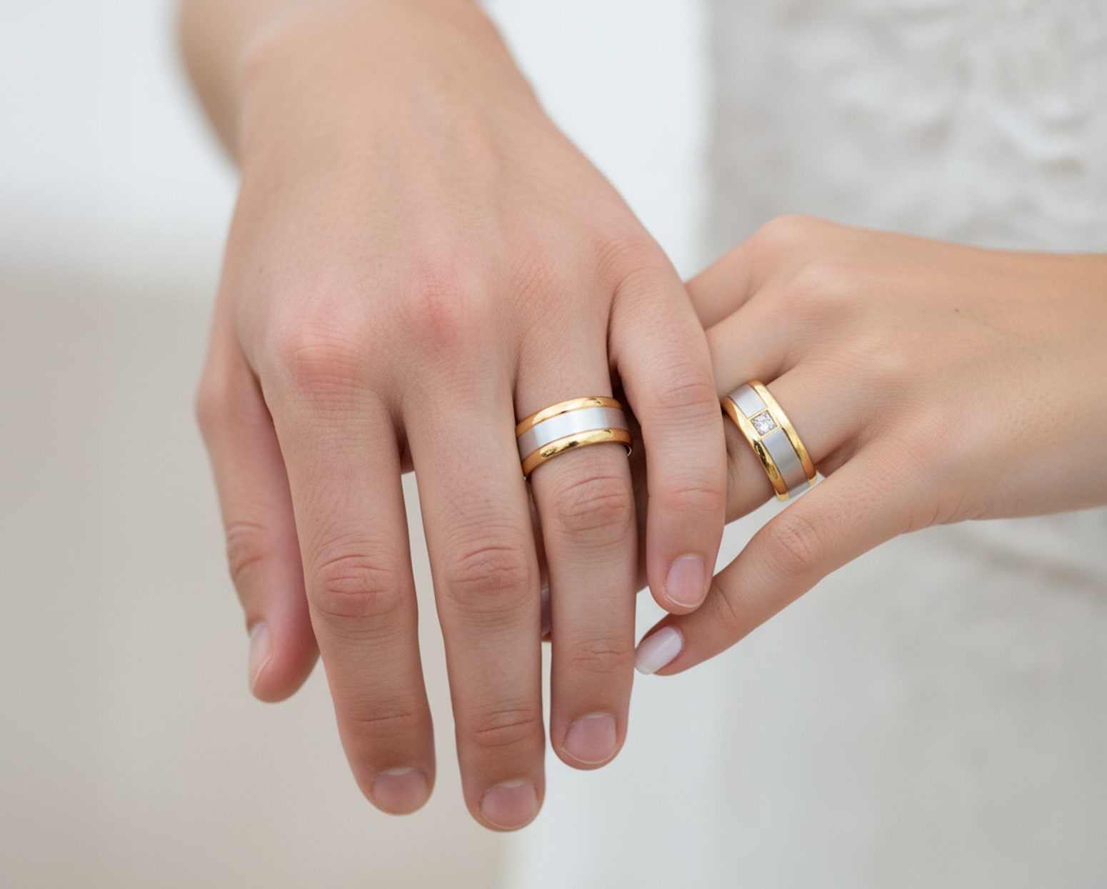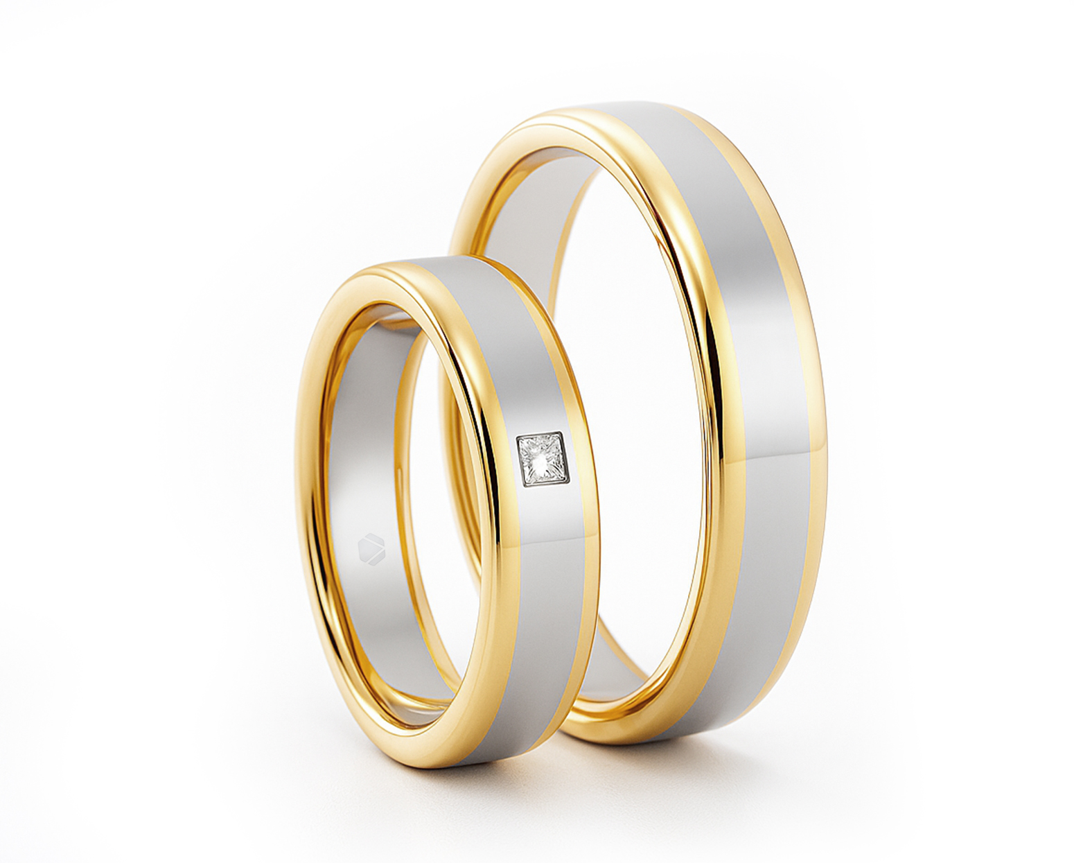 Las líneas limpias de las argollas Almendra Bicolor con diamante son la opción para quienes buscan identidad en las argollas de matrimonio, con el contraste de sus metales y el diamante brillante en la argolla de ella.