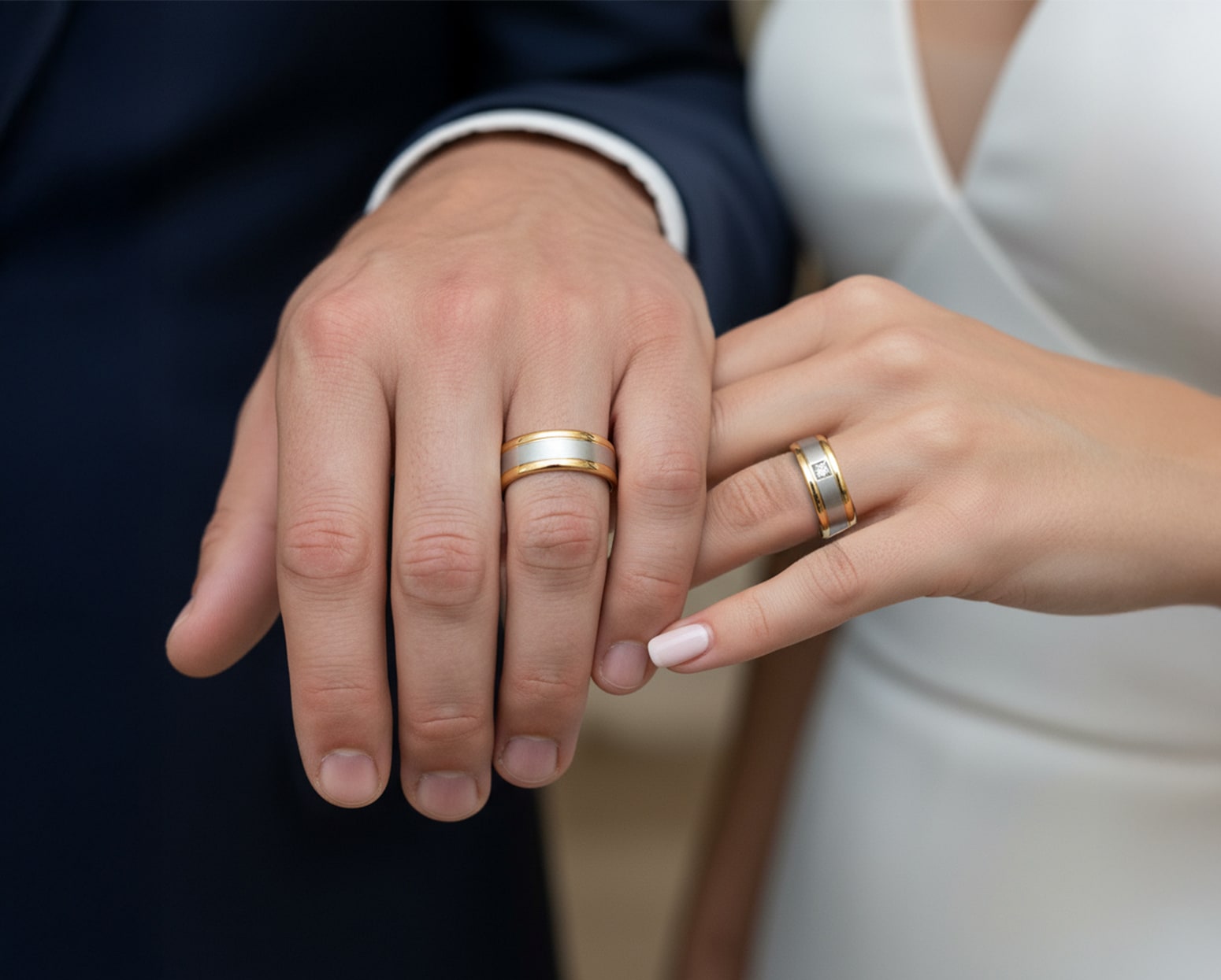 Las argollas Almendra Bicolor con Diamante son una hermosa e innovadora propuesta para novios que buscan una silueta contemporánea y sofisticada.
