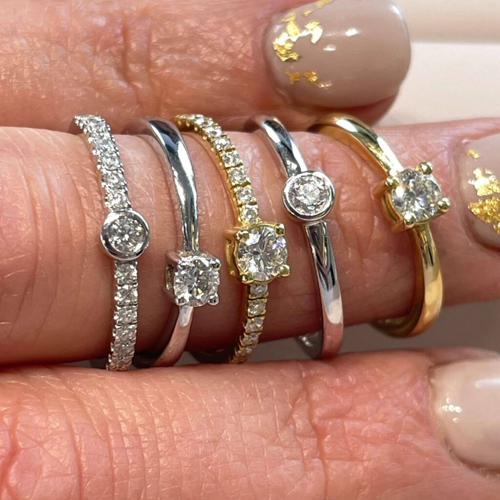 El solitario, con su piedra central, concentra toda la luz en un solo punto. Es el clásico de los compromisos, pero también puede lucirse a diario por su elegancia atemporal. Su sencillez lo hace ideal para quienes prefieren una joya única que hable por sí sola.