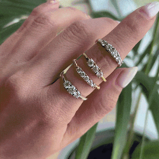 Diseños que simbolizan la unión y la continuidad. Los tresillos —con tres piedras— representan el pasado, el presente y el futuro; los quintillos amplifican ese equilibrio con una presencia más intensa. Perfectos para aniversarios o celebraciones especiales, aunque también se integran bien con argollas de matrimonio o se llevan solos como anillos de mano.